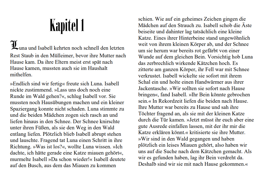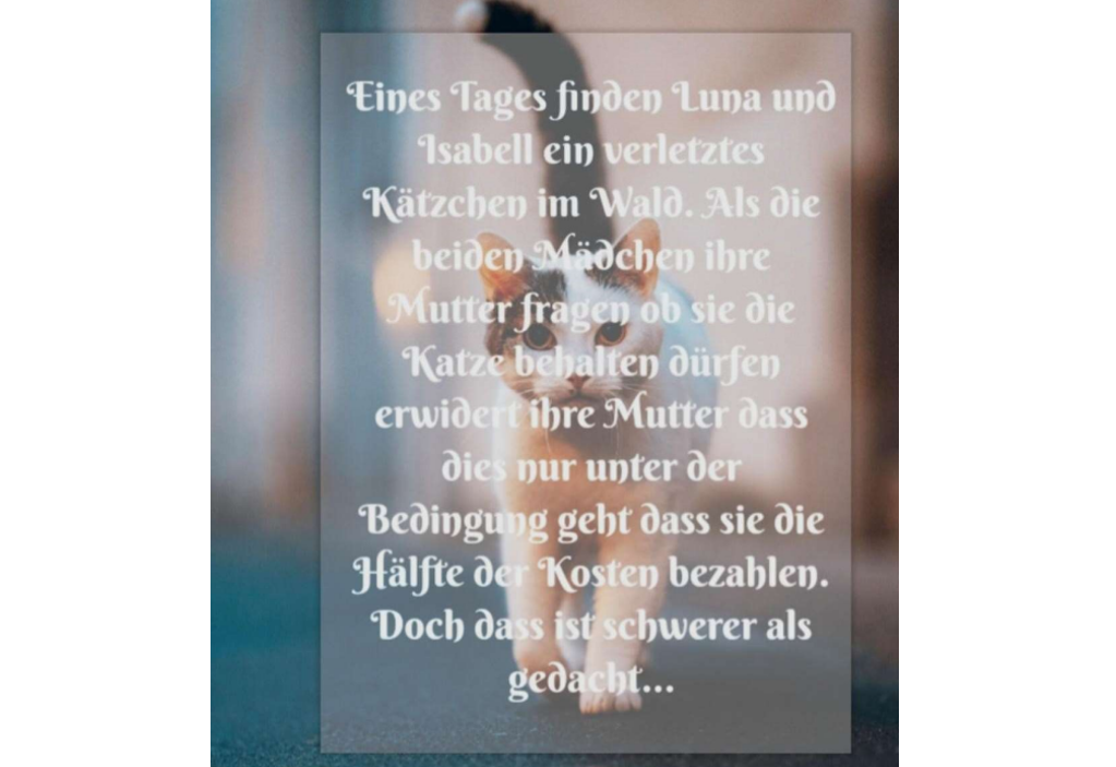 Im Rahmen dieses Projekts haben zwei Schülerinnen ein Buch verfasst. In diesem Buch geht es um zwei Schwestern, die eine verletze Katze im Wald finden und sie natürlich behalten wollen. Ihre Mutter erlaubt es nur unter der Bedingung, dass die Mädchen die Hälfte der Kosten übernehmen. Als die beiden Mädchen einwilligen, ahnen sie noch nicht was das für sie bedeutet…