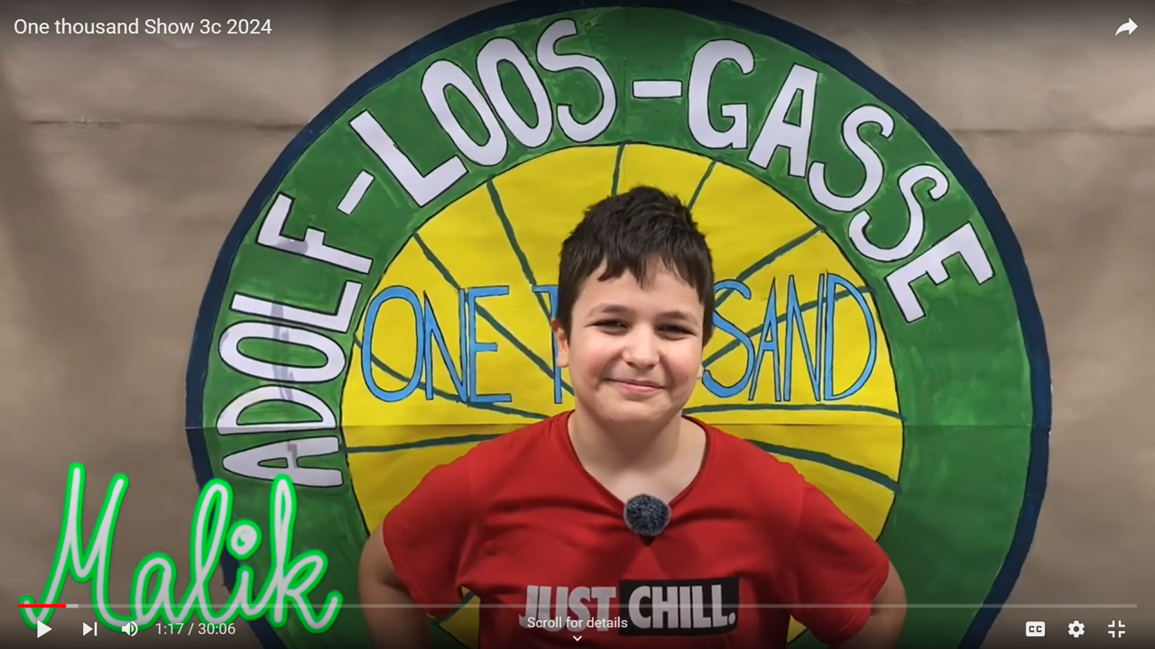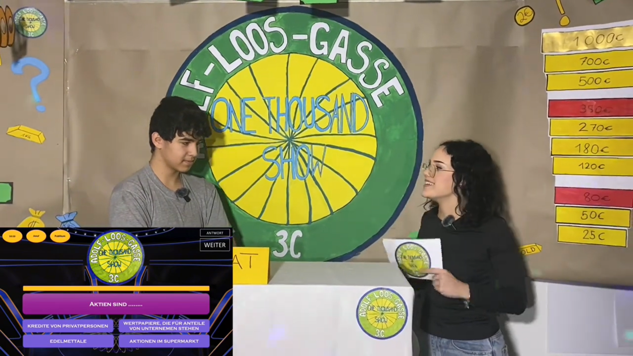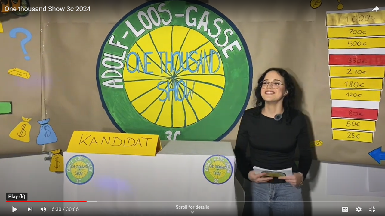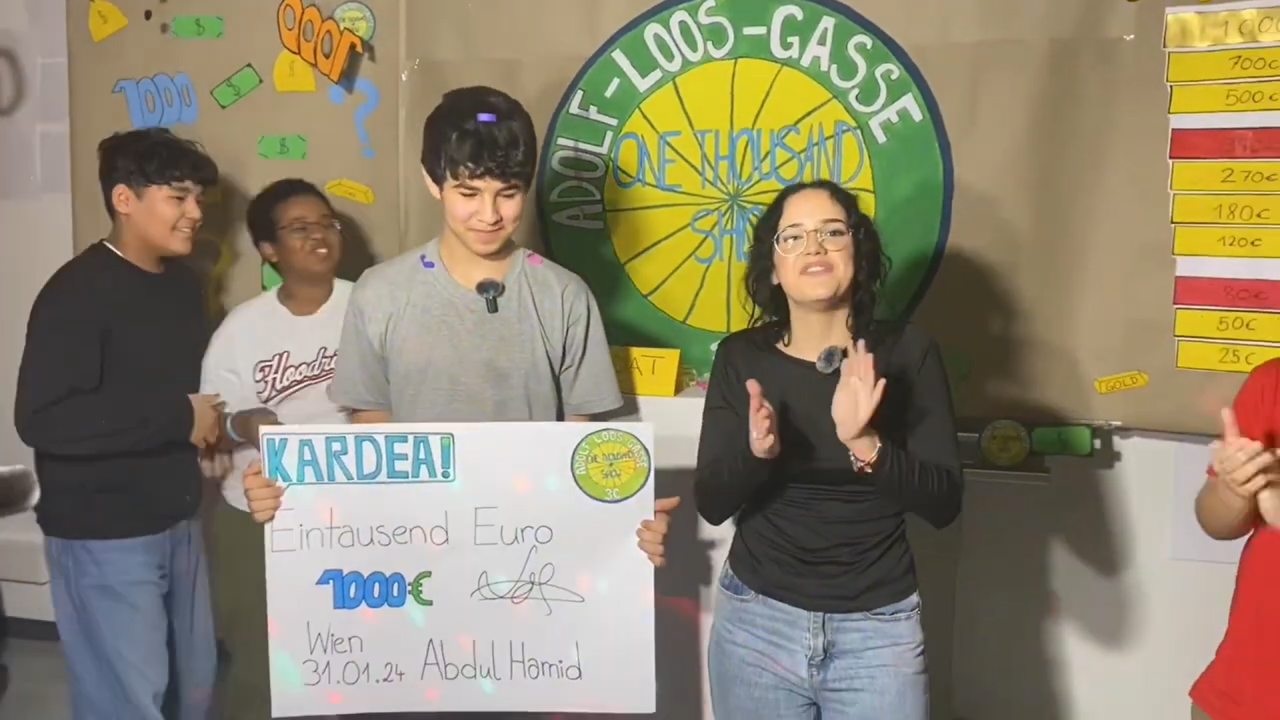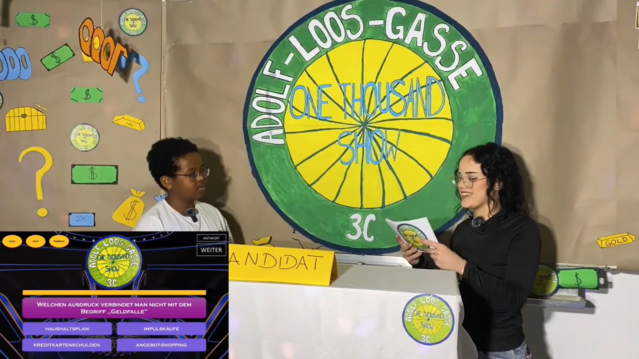 Angelehnt an das Format „Die Millionenshow“ hat die Klasse eine Quiz-Show selbst gestaltet – die „One thousand Show“. Durch die gestellten Fragen werden verschiedene Aspekte der Finanzbildung und rund um das Thema Geld behandelt. Ziel ist es, grundlegende Informationen zu vermitteln, Motivation für die weitere Auseinandersetzung mit dem Thema zu schaffen und die große Bedeutung des Themas aufzuzeigen.