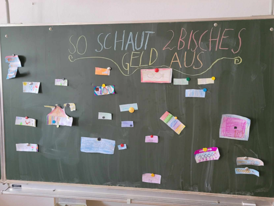 „Unter dem Motto „Die 2b und das Geld“ lernten die Kinder grundlegende Konzepte rund um das Thema Geld kennen. Ein Fokus liegt auf der fächerübergreifenden und langfristigen Umsetzung. Im Rahmen von verschiedenen Aktivitäten haben sich die Schüler:innen in den letzten Monaten mit den Themen Einnahmen, Ausgaben und Sparen auseinandersgesetzt. Eine Ausweitung des Projekts in der Zukunft ist geplant – u.a. auch die Einbeziehung von Eltern und Erziehungsberechtigten.