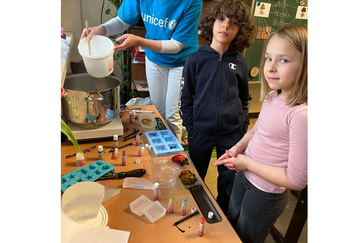 Im Rahmen eines klasseninternen Projekts stellten die Schüler:innen der 2b eigene Seifen her, gestalteten Verkauf und Preisfindung selbstständig und entschieden demokratisch über die Verwendung des Erlöses. Ziel war es, Geld für zukünftige Projekttage zu sparen und gleichzeitig etwas Gutes zu tun – inspiriert von der gemeinsam gelesenen Geschichte Ein Hund namens Drei. So wurde die Hälfte des eingenommenen Betrags an SOS-Kinderdorf gespendet – ein starkes Zeichen für Eigeninitiative, Mitbestimmung und gelebtes Mitgefühl.