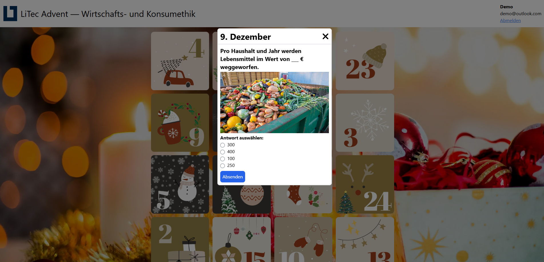 Im Rahmen des KARDEA!-Projekts haben sechs Schüler:innen einen interaktiven Adventskalender zu Wirtschafts- und Konsumethik entwickelt. Ziel des Projekts ist es, auf die Problematik des Konsumrausches aufmerksam zu machen und zu nachhaltigem Konsum zu sensibilisieren – insbesondere vor Weihnachten. Das Projekt befasst sich mit Themen wie Wirtschaftsethik, der Produktionsreise einer Jeans und dem nachhaltigen Konsum von Lebensmitteln in Österreich. In Zusammenarbeit mit den Lehrkräften wurde die Projektidee in Gruppenarbeit ausgearbeitet, wobei die Schüler:innen ihre Aufgaben entsprechend ihres Wissens und Könnens aufteilten.